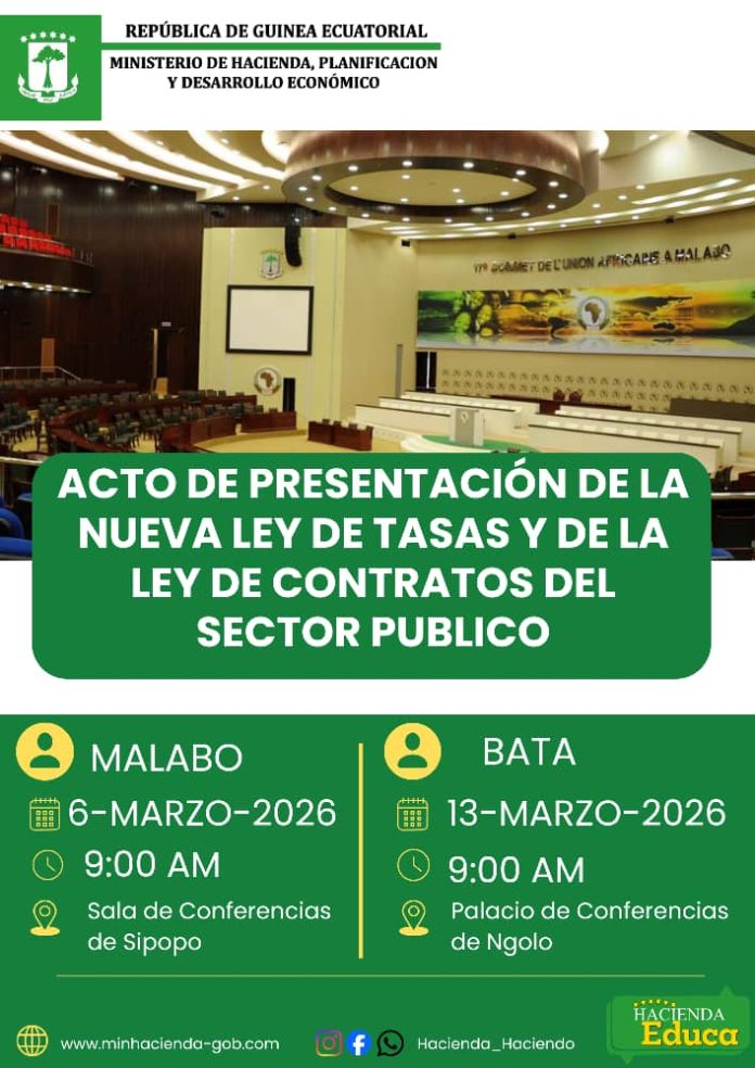 En el marco del proceso de modernización del ordenamiento jurídico-económico del Estado y del fortalecimiento de la gestión de las finanzas públicas, el Ministerio de Hacienda, Planificación y Desarrollo Económico llevará a cabo el acto oficial de presentación de la nueva Ley de Tasas y de la Ley de Contratación Pública de la República de Guinea Ecuatorial conforme al siguiente calendario: